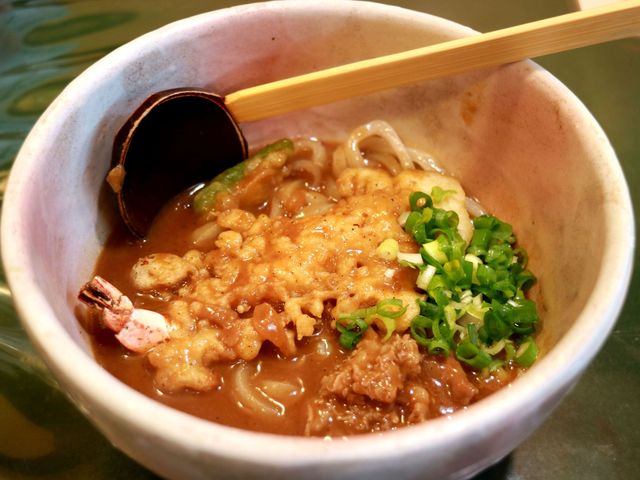 注文したのは上カレーうどん。海老天と野菜天が入っています。