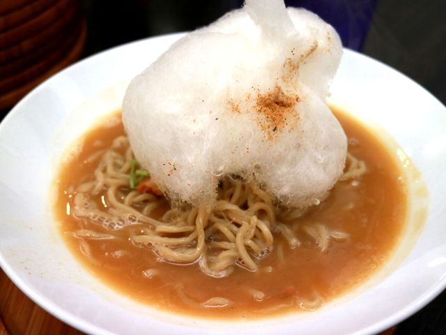 さて、こちらのラーメンには綿飴が載ります。驚愕です。