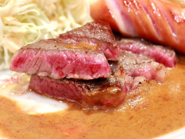 ステーキはミディアムレアで、歯が要らないぐらいやわらか。