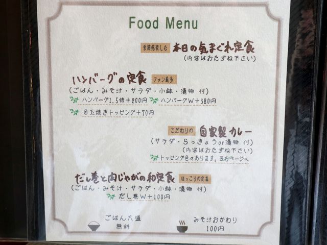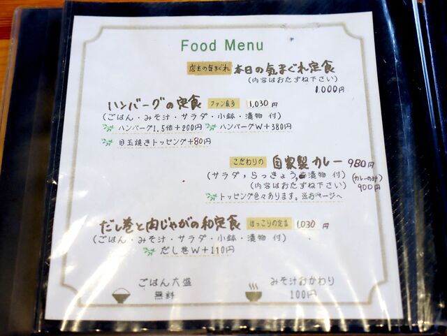 白米大盛・おかわり無料。ハンバーグW(量2倍)+380円。だし巻W+110円。