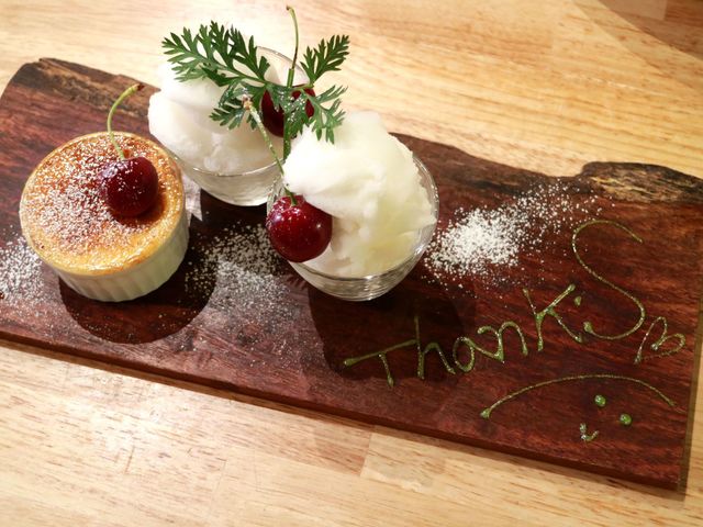 食後のデザートを載せた木皿にはゼリーで「Thanks」とメッセージが。オシャレです。