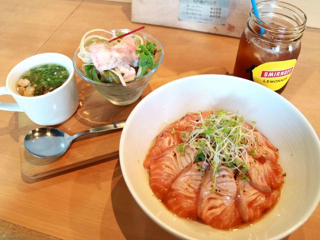 土日限定「トロサーモンとアボカドの丼セット」は、サラダ・スープ・ドリンクつき。