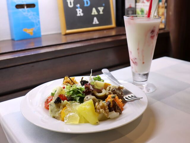ドリンクは「本日のジュース」の自家製いちごラッシーを選んでいます。