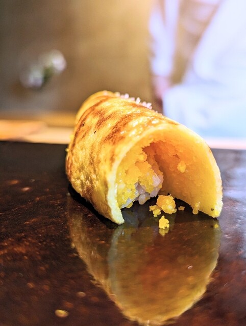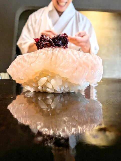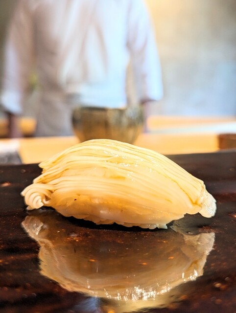 鮨は長崎のケンサキイカ、たくさん包丁を入れた烏賊は甘みがあってめちゃくちゃ美味しい