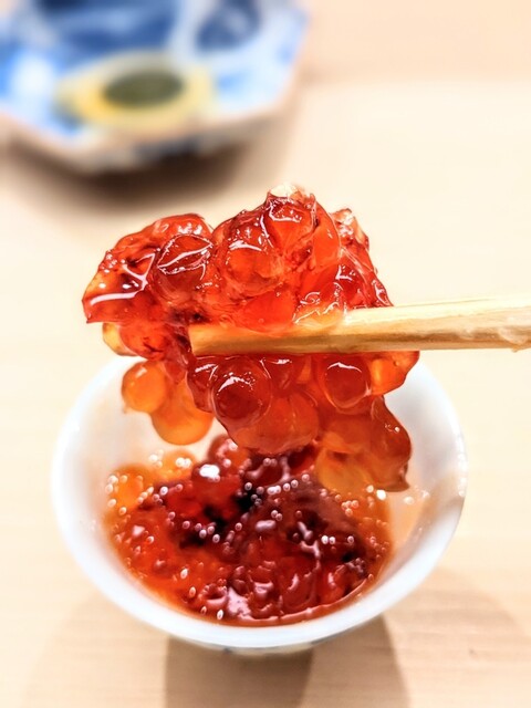 最初のカワハギの肝醤油おつくりから最高においしく筋子の醬油漬けのねっとりとした触感は日本酒を誘いますね~!