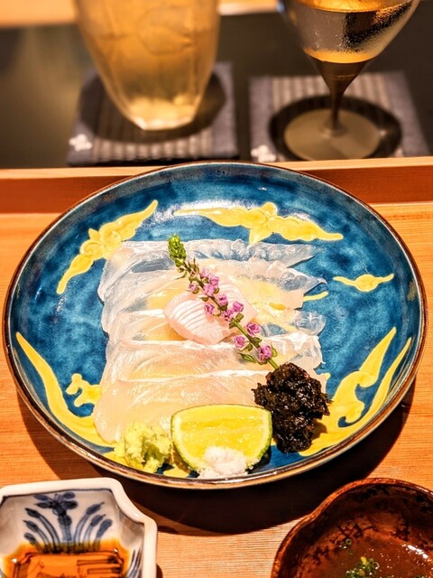 ●萩のクエと車海老のお造り 金山寺味噌