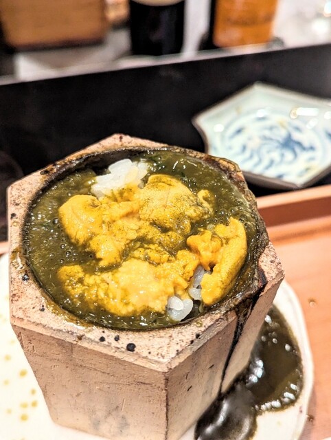 溶岩でつくった熱く熱した器に鮑の肝ソースを入れてその中に大きくカットされたアワビを投入してグツグツと煮込みそれをいただいた後に雲丹とシャリを再投入して食べます!これがたまらなく美味しいんです!