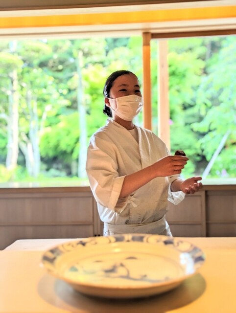 お店の前に到着すると後ろに山、左手には中庭が美しく店内からの庭を眺めると新緑の景色がとてもいい感じです!