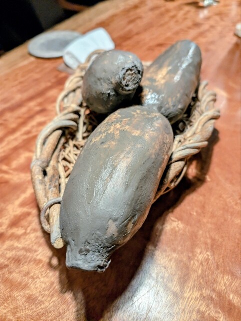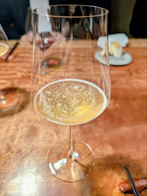 白カビで峯村牛のもも肉を熟成した生ハムに里芋を1日昆布水に漬けてゆっくりと30分間フリットいた里芋を巻いて食べる。里芋がサクサクで峯村牛の肉の旨みがハンパなく、最初から胃袋つかまれるめちゃくちゃ美味しい1品からスタート
