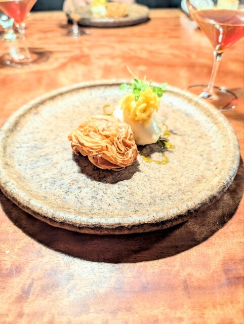 出てきたのは見た目も美しい根セロリの真の部分をスライス芳醇なバターの香りを身に纏って出てきました!それを手で1枚づつ剝がしながらもう一方の根セロリのジェラートをとりそこへ乗せて食べるとパリッとした食感で、それが合わさった瞬間の味わいは悶絶する美味しさでした。