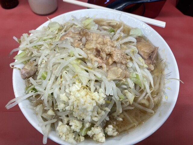 小ラーメン(250g)と生卵をオーダーし、コールは全マシ。微乳化系スープで麺硬さは普通。バランスが素晴しい。生卵や薬味を駆使すれば、量の多さは感じず。最後まで杯の熱さがキープされる点も嬉しい。チャーシューは脂少なめで肉肉しい点も好み。