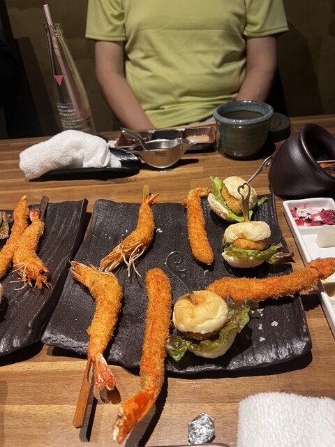 創作串揚げで、定番の野菜、エビはもちろん、クリームチーズに生ハムにベリー系のソースが乗っかったやつ等いろんな串揚げをいただくことが出来ました。