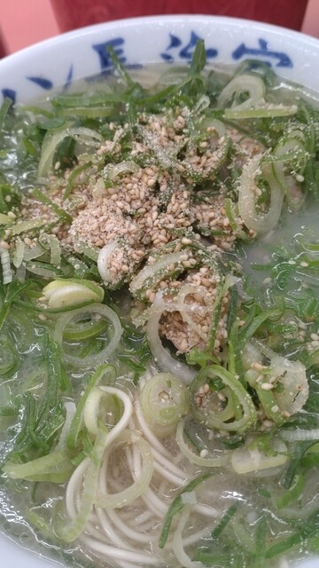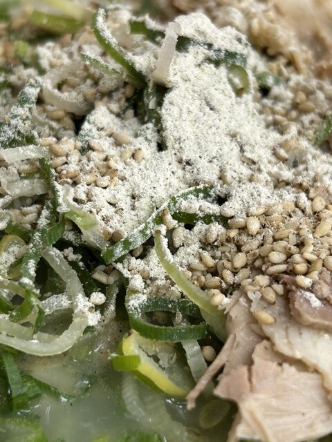 まずは『ナマのネギ多めで』ほいほい1分ちょいで着丼です。おーネギが多くて良き事よ\(//∇//)\ゴマも多めに振ってコショー少々でいただきます。