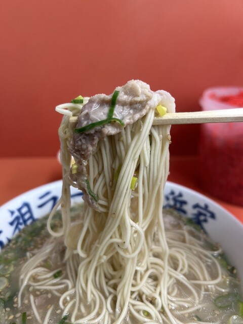 さて、今日の元祖の味は?おー少しだけ薄め(^。^)少しだけタレかけます!すると濃くなっちゃった!この微妙さが良いねf^_^;麺はバリバリのナマ!バリカタよ!歯応えと麦の香り(味)が好きよ!