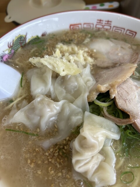 当然、他の常連様も1巡目に複数組おられましたよ!そして優しい会話もあり心温まりました(๑˃̵ᴗ˂̵)最後のラーメン!ワンタン麺…そして玉めし!ほぼ同時に着丼し、最後もやる事は同じです。コメントも同じね(^◇^;)ニンニク1個クラッシュして…