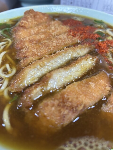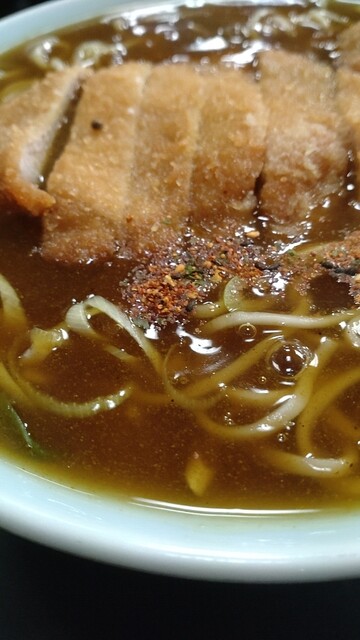 カツカレーそばには辛味はないので辛い物好きとしては一味を少しフリフリします。カレーそばの味を損なわない程度ですね。