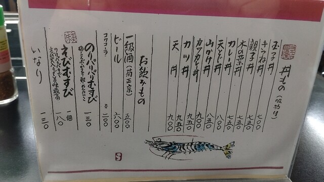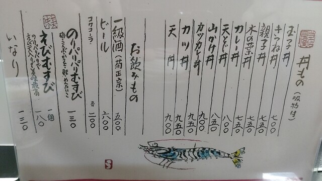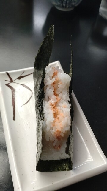 さて10:55有難いことにフライング開店です!余裕で一巡で入れた!相席は仕方ないですね!オーダーは勿論カツカレーそば¥1,050を¥150で大盛でお願いします٩( ᐛ )وそれと最後なので、えびむすび¥210もお願い\( ˆoˆ )/えびむすびが最初にきます!食べてカツカレーそばを待ちます!この待ち時間ってどんな店でも意外と好き!早く早く!なんて思いません!楽しいばかり(๑˃̵ᴗ˂̵)