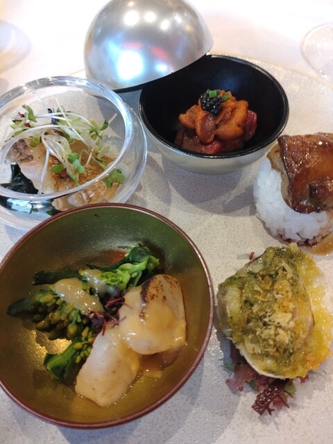 前菜五種盛り…和牛 生雲丹 キャビア/玄海産真鯛 胡麻/フォアグラ寿司、等