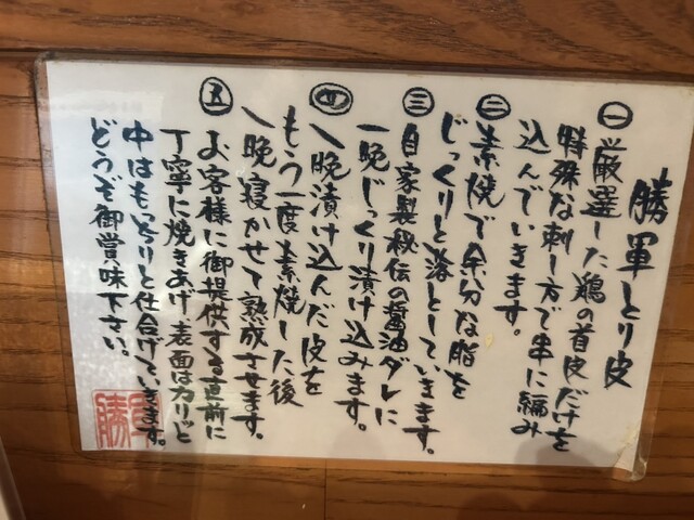 五本盛り!五本盛りは…順に.勝軍とり皮、軟骨入りつくね、砂ズリ、豚バラ、鶏もも…全部美味し!そしてネタがデカい(厚い)のでコスパ良い…に、なります♪(*^^)o∀*∀o(^^*)♪とりあえず5本盛り完食手前で追加オーダーです!