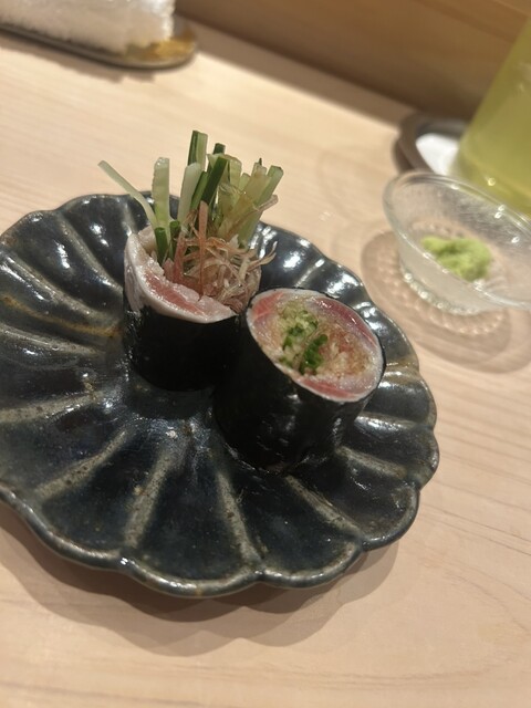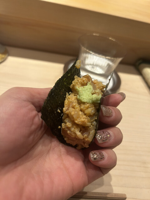 特に、つまみでは、鰹の藁焼き、蒸し鮑の肝ソース、イワシの海苔巻き、白子からすみ、にぎりでは車海老(レアで中に頭の味噌のソースが入ってる)、うに、あん肝が最高。