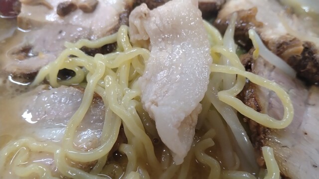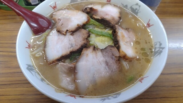 いい感じの野菜の量。スープの中にもたっぷり隠れている。チャーシュー5枚。いつもより豚バラが多い感じ。おかみさんのはからいか?