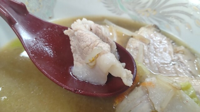 ここからは野菜と豚バラを食べ進め、途中でチャーシュー。豚バラの甘みと野菜の甘みが本当においしい。そのエキスがしみ出たスープもおいしい。みそ味はやや控え目だがクセになる味。
