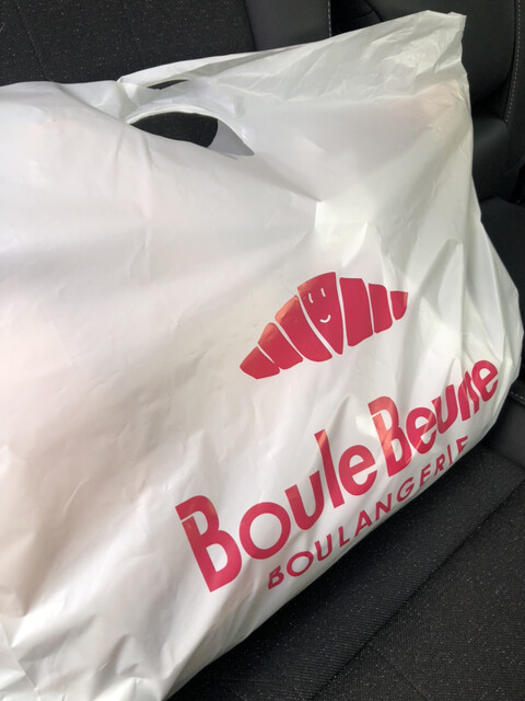 うちらは、食パンとバケットの他に昼食用にクロワッサン(ぶーるぶーる)、カレーパン(フォカッチャ)、ソーセージパン(しまうた)、コーヒー系の菓子パン(カフェ)、チョコ系の菓子パン(パンガトーショコラ)、ブラン、フリュイを購入。