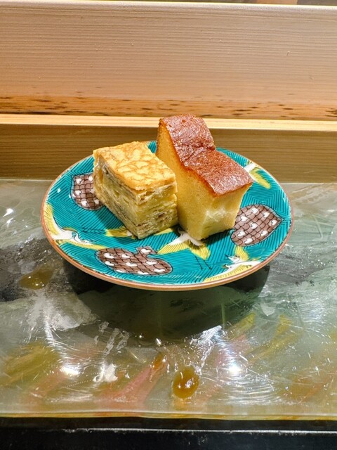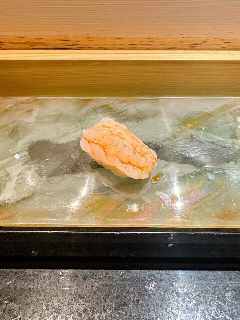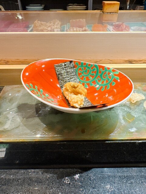 本日は小鮎、冷製茶碗蒸し、ハナダイ、かすごだい、甘エビ、ビワマス、本マグロづけ、中トロ、コハダ、アジ、かつおたたき、毛ガニ、シメサバ、ほうきはた、キタムラサキウニ、アナゴ、スープ、玉子、デザートの順での提供。