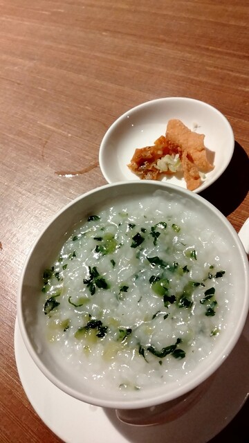 下部は白粥、上部は青菜のスープあんかけ的なお粥の二層になっているようです。