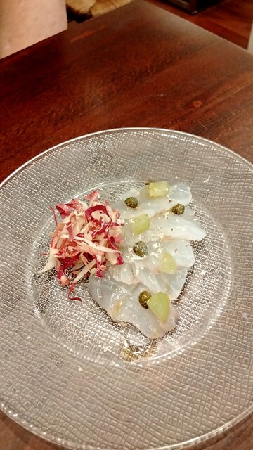 鮮魚のカルパッチョ♡「添えはカステル・フランコです(^-^)赤いのはオーシャンベリーです♫」とスタッフさん♫酸味の仄かなお味で美味しいそうです♡