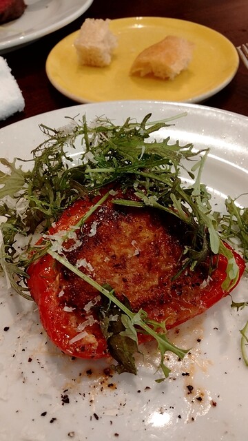 パプリカの自家製サルシッチャ詰め⭐️ジューシーに焼かれたパプリカの美味しさ⭐️意外にさっぱりした大きなサルシッチャがボコっ!と♫