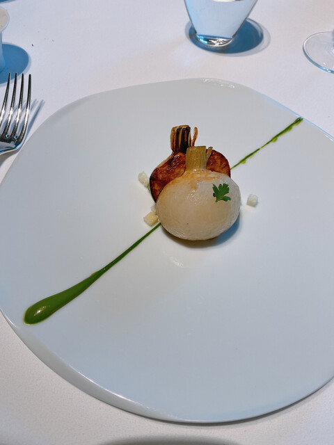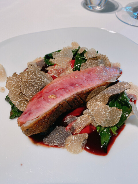 メインは七谷鴨のロティ 帆立と焦がし葱のピュレが合う〜 安心の美味しさ! 去年の鳩の方が感動的な美味しさだった!