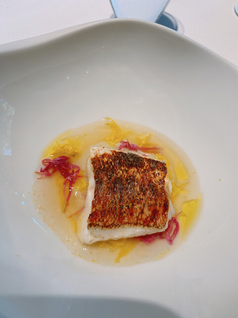 甘鯛のロティと菊芋のクリスプ 最高❗️骨の出汁のアラクレームと山椒オイル もう完璧 山椒の風味と菊芋のクリスプがうまい