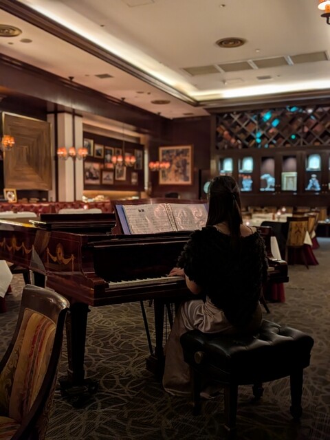 高く開放感のある天井や豪華な装飾、ピアノの生演奏も楽しめる非日常空間。