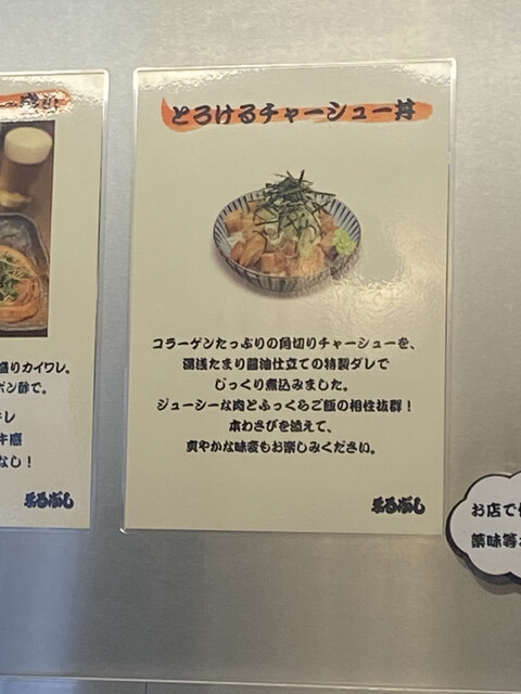炙りチャーシュー、角切りチャーシュー、味玉、海苔大、メンマ、ネギ、玉ねぎが入ってスープも増量。