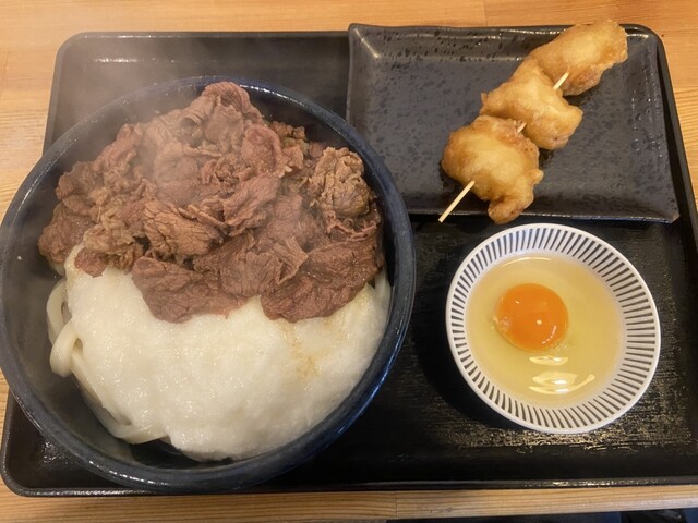 肉とろろぶっかけうどん 1050円(冷 麺量1玉アップ+150円)(卵のせ前)