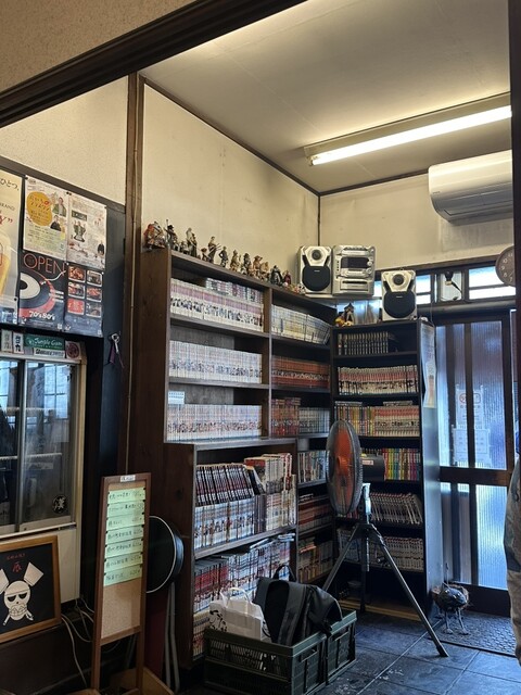 店内はカウンター4席とテーブル2つのみで漫画本がめちゃくちゃあります。