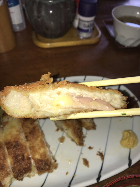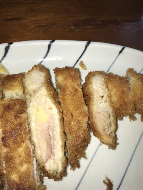 焼かつはチーズ、ハム、大葉が豚肉に包まれています。