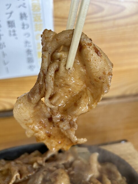 鉄板の上にはキャベツともやしが熱せられその上に豚ロースが4枚程でしょうか甘辛のタレに絡んでます。