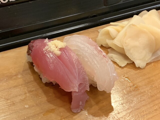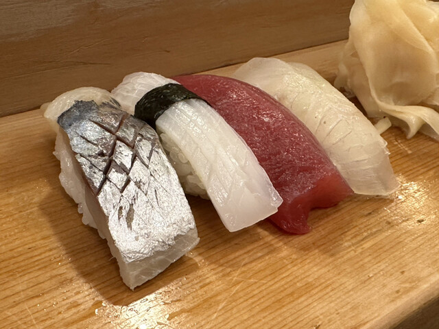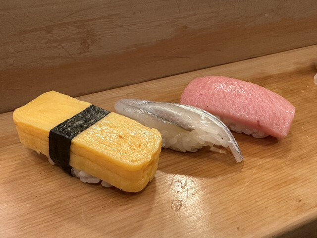 左から、ヒラメ昆布じめ、玉子、カンパチ、