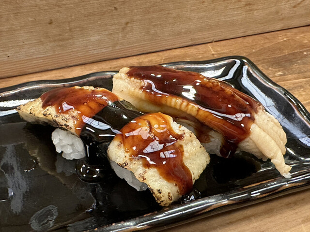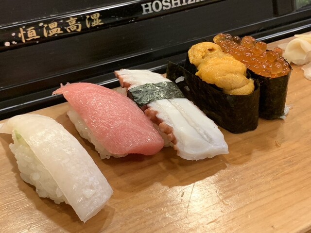 左から、エンガワ、中トロ、タコ、ウニ、いくら