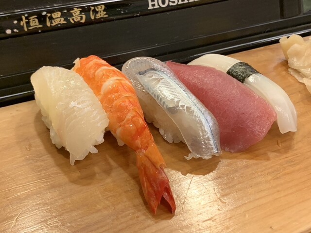 左から、ヒラメ、海老、サヨリ、マグロ、イカ