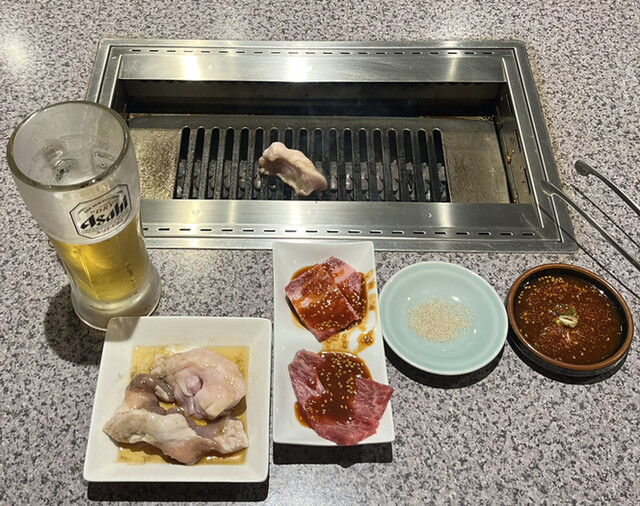 夜でも注文出来るランチセットにちょい飲みセットも追加されたので頼んでみました。生ビールとロース、カルビが二切れずつで1500円。ワンコインメニューの名物ホソを追加して昼焼肉を堪能。厚めのロースが旨い。ホソは相変わらずのボリュームでもう一杯、もう一皿いけそうでしたが今日はあまり動いてないので止めておきました。