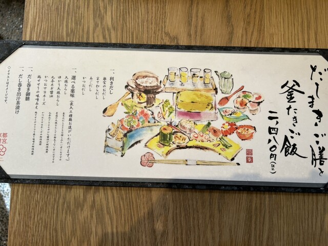 メニューは1つなので、選択するものは4種類の中からだし巻き卵にする出汁を1つと薬味を3種選びます。迷ったら離宮のオリジナル出汁をと勧められたのですがテークアウトで弁当を買って帰るつもりのだし巻きが全て離宮オリジナルだったので本日はカツオとサワラをチョイス。娘も私もサワラを選びたかったのですがここはあえて違ものを選びました。残りのアゴ出しは家でもよく使うので今日は選択しませんでした。