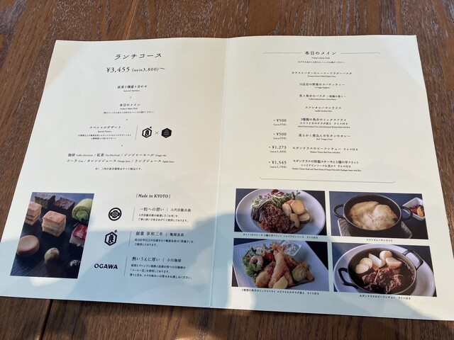 前菜三種、メイン、デザート、ドリンクのセットで、メインは八種類から選べます。今回は、カラスミバターのシーフードラグーパスタとスフレオムハヤシライスと三種類の魚介ミックスフライをチョイス。パスタとハヤシライスが美味でした。デザートも和菓子屋さんのお菓子を店員さんが持ってきてくれて三種類選べるスタイル。京菓子を少し楽しめます。ロームシアター横、岡崎公園、平安神宮、京セラ美術館近くにあり、店内の意匠も雰囲気があり、食事との併せ技で魅力的なお店でした。