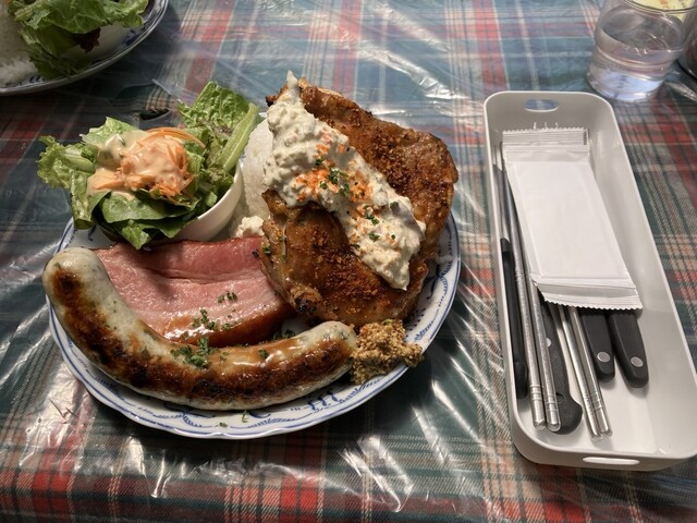 たまたま陶器市ついでにランチをと思い発見したボリューミーなランチのお店。評判通りのボリューム。セットの内容は大きな自家製ソーセージ20㎝?、グリルチキン200g?、ベーコンステーキ20㎝?&ライス、サラダ、ドリンク。しかもライスはおかわり自由。50代のおっさんにはキツい量だった。妻は半分くらい残してしまったが、お持ち帰り用のパック用意されていてありがたい限り。ちなみにGW中のため開店時間を早めているようで10時半到着、一番乗りで入店できました。食べ終えた12時前くらいには10人以上が行列。駐車場もいっぱいで店の進入路前の県道に車も並んでました。