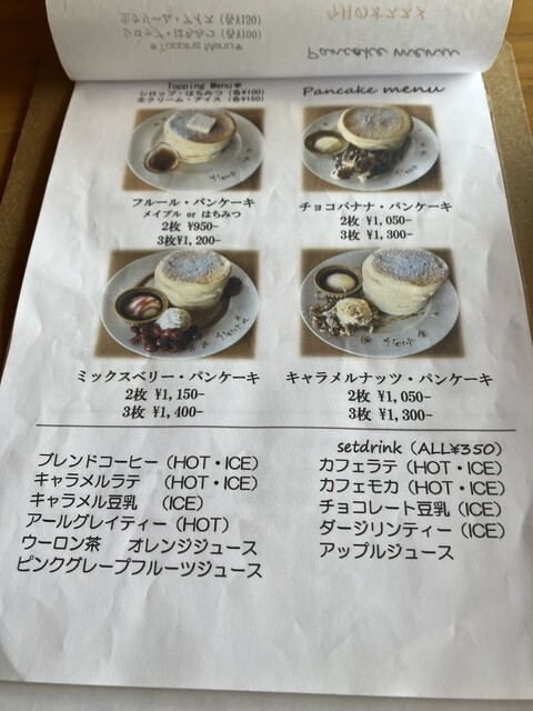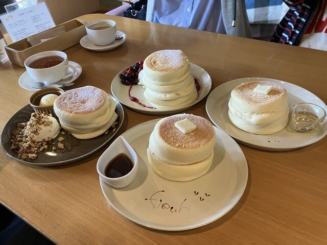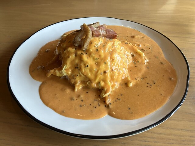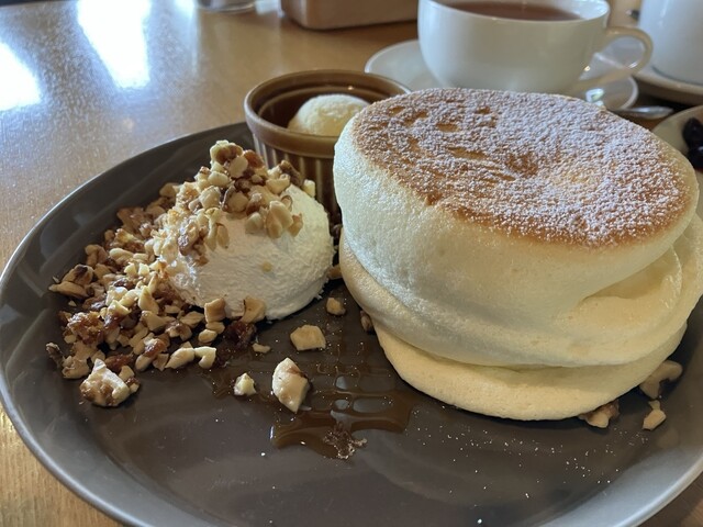 お店は信楽駅に突き当たり左に行ったところにある。この日はGW初日駅前陶器市初日と重なり、イベント会場の中を車でゆっくり徐行しながら向かうことに。11時開店の1時間以上前に着き、陶器市でブラブラしているところにお店の方が到着。予約表に記入して待ちました。5年ぶりに伺ったが、日本家屋にテーブルを配置した店内は変わらず、目当てのパンケーキ(ティラミスパンケーキとキャラメルナッツパンケーキ)、そしてメニューを見ておいしそうだったのでベーコンと揚げレンコンの濃厚ミートクリームオムライスも注文。パンケーキは2、30分かかるのでオムライスが先に到着。中が白飯だったので少し期待外れ。パンケーキはフワフワトロトロの相変わらずの美味しさでした。