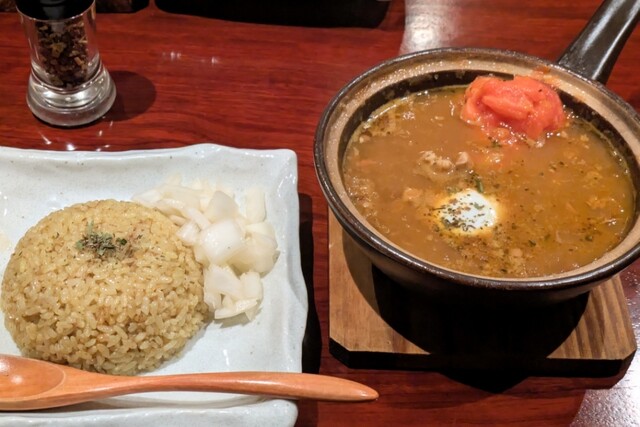 大事に取り置いた温泉卵を割ると濃厚な黄身がとろり。オリジナルスパイスを一振りしていただくと、コクに軸足を置いた味わいに変化。ピクルスの酸味がアクセントになった、極上のカレーおじやが楽しめる。