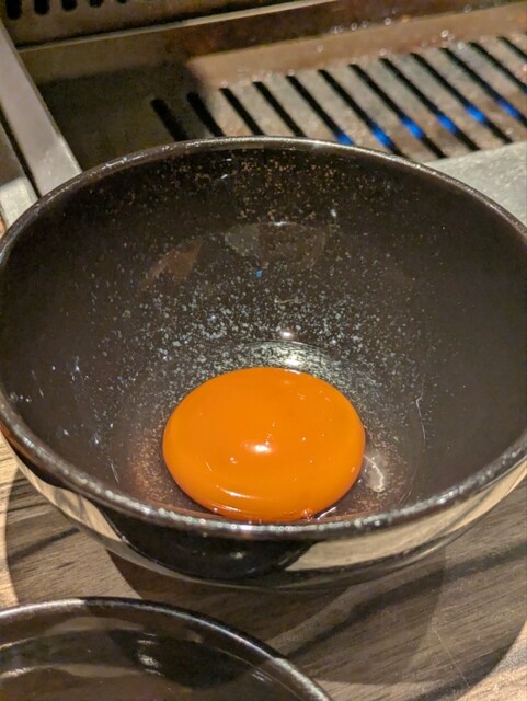 表面をサッと炙って、カルビと同じタレ、そして野原焼の卵を