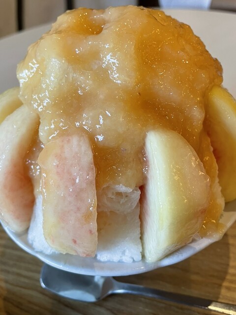 ふわふわ氷に生桃と桃シロップがふんだん乗っかってます。それに加えてふわふわ氷には杏仁シロップがかけてあり、甘すぎない程よい甘さ。